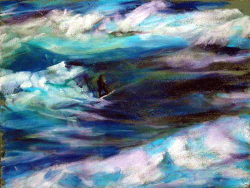 In 2008 the bridge between the Beachcomber motel and some condominiums was opened. It enabled us to watch the waves from a cliff as opposed to a hotel balcony. We spent the afternoon photographing the surfers from the cliffs above them. This is the first "surfer painting" in a series. Its on Canson paper.